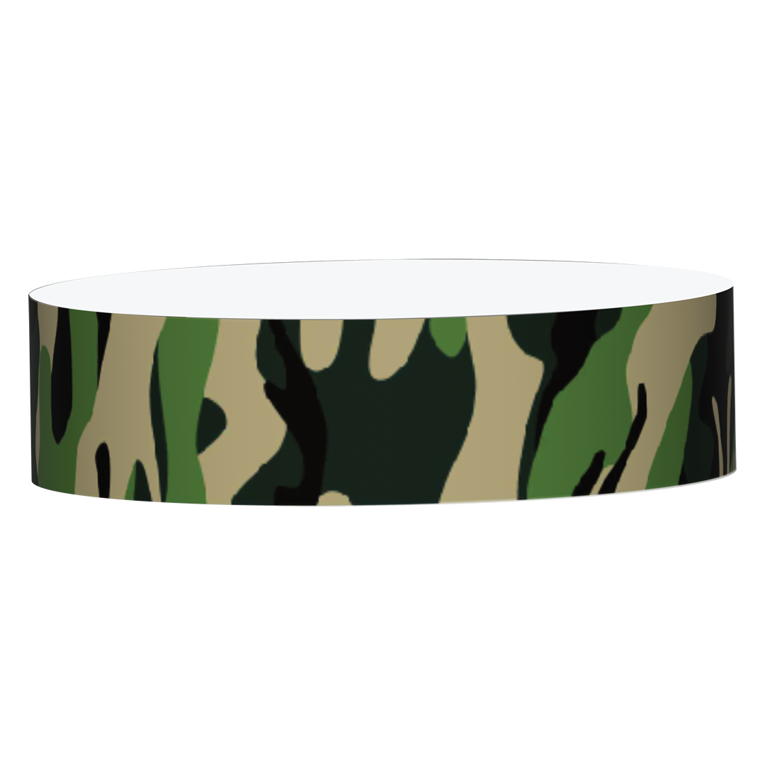 A rugged camouflage design makes these wristbands a great fit for outdoor events, paintball parks, and adventure-themed gatherings. Easy to spot while blending into themed environments.